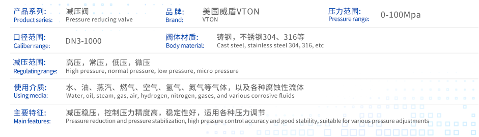 进口蒸汽法兰减压阀(威盾VTON),Steam flange reducing valve,是指采用法兰的连接方式,法兰标准有美标150磅,300LB,600LB,900LB,1500LB, 国标PN16,PN25,PN40,PN64,PN100,PN160,PN250的法兰等级标准,能将阀前的蒸汽压力减到所需要的出口压力,并将压力稳定在所需要的压力值的减压阀,属于可调式先导活塞式减压阀。由主阀和导阀两部分组成。主阀主要由阀座、阀阀盘、活塞、缸套、弹簧等零件组成。导阀主要由阀座、阀瓣、膜片、弹簧、调节弹簧等零件组成。通过调节调节弹簧压力设定出口压力,利用膜片传感出口压力变化,通过导阀启闭驱动活塞调节主阀节流部位过流面积的大小,实现减压稳压功能。进口蒸汽法兰减压阀主要用于蒸汽管路,起到减压稳压作用。