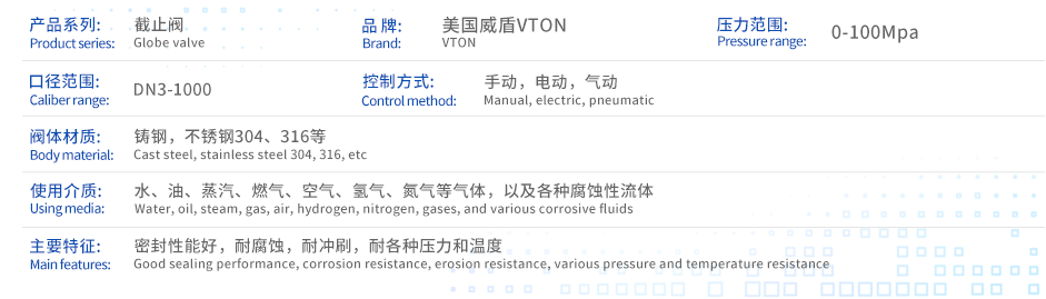 进口不锈钢波纹管截止阀(威盾VTON),Stainless steel bellows globe valve,也叫不锈钢304波纹管截止阀,不锈钢316波纹管截止阀,不锈钢材质波纹管截止阀,适用于公称压力PN1.6~16MPa,工作温度-29~350℃的易燃、易爆、剧毒、毒性流体、高温导热油、液氨等介质。广泛应用于:石油化工、化纤纺织、塑料造纸、电力钢铁、印染橡胶、天然气等其它气体系统中