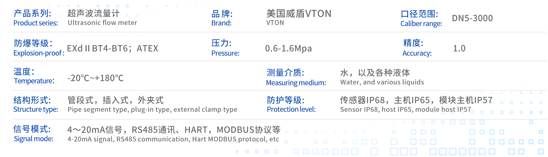 | 控制器:故障自诊断功能 | 防护等级:传感器IP68,主机IP65,模块主机IP57 | |