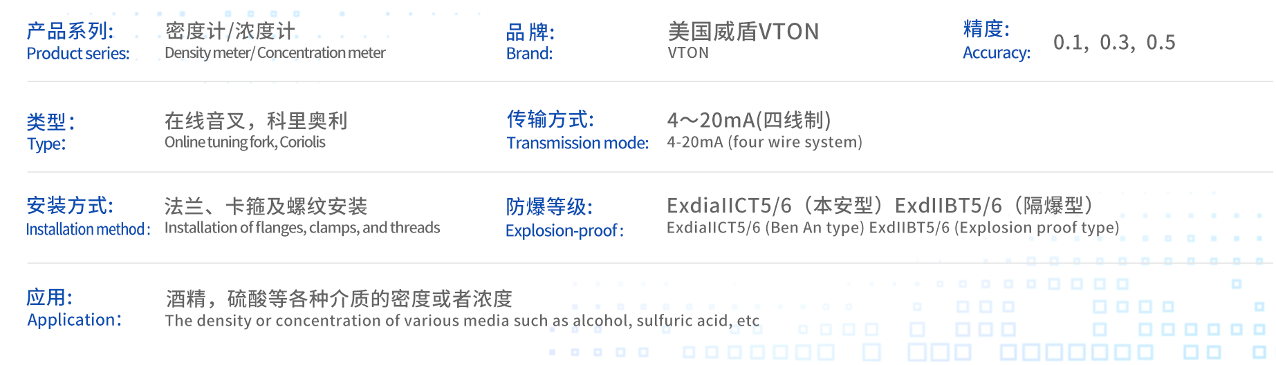 | 浓度范围:0~100%(20℃),按使用情况,可标定为某个量程段 | 密度范围:0~2g/ml,按使用情况,可标定为某个量程段 | |